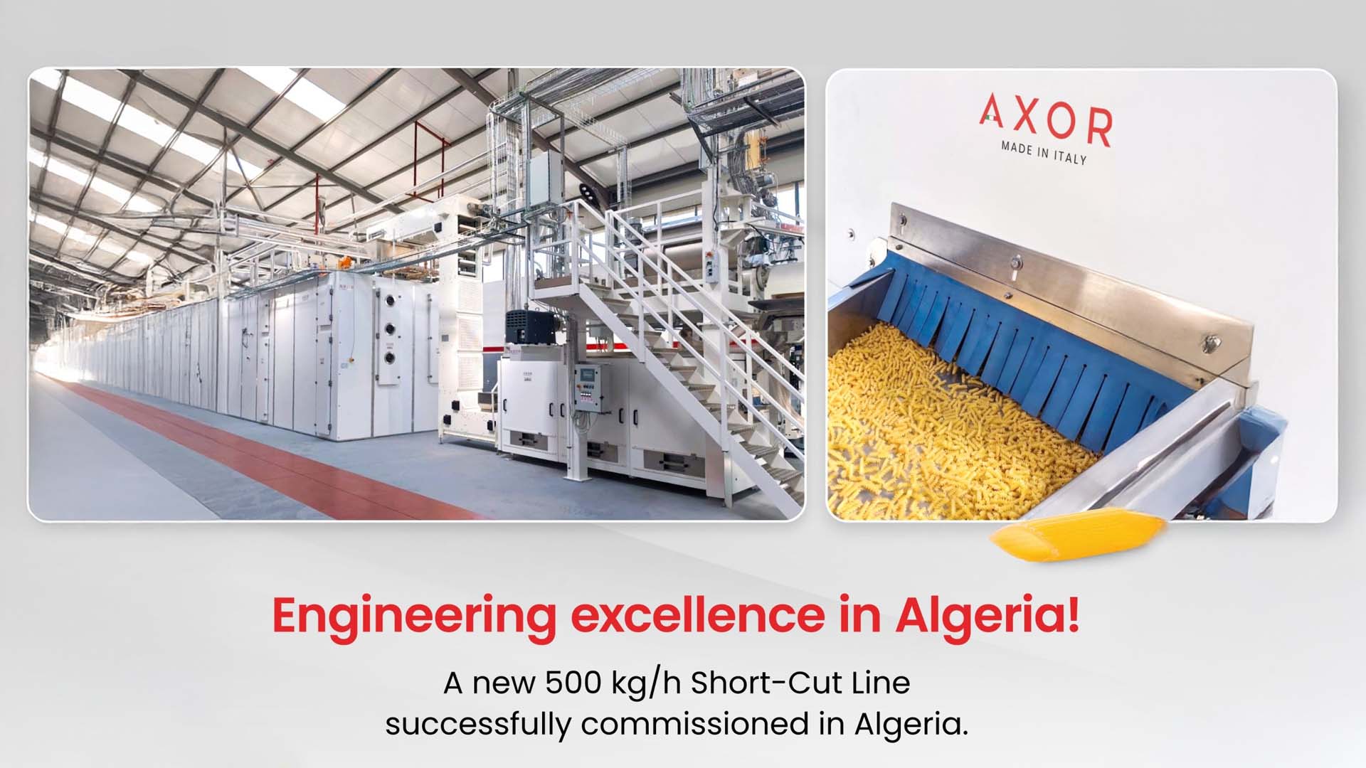 “AXOR, ekibi Cezayir’de 500 kg/saat kapasiteli bir Short-Cut Hattı’nın devreye alınmasını tamamladı. Bu proje, makarna teknolojisine olan bağlılığımızı, hassasiyetimizi ve tutkumuzu mükemmel bir şekilde yansıtmaktadır. AXOR hatlarının dünya çapında faaliyet göstererek müşterilerimize kalite, yenilikçilik ve güvenilirlik sunmasından gurur duyuyoruz. “